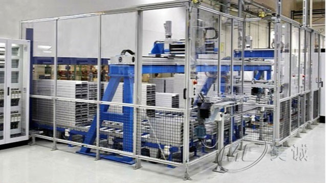 機械設(shè)備護欄是在生產(chǎn)流水線外設(shè)立防護措施,局部或全部建立鋁型材防護圍欄,以保證人員和設(shè)備安全,部分區(qū)域會安裝門或留出通道便于貨物進出和人員檢修。