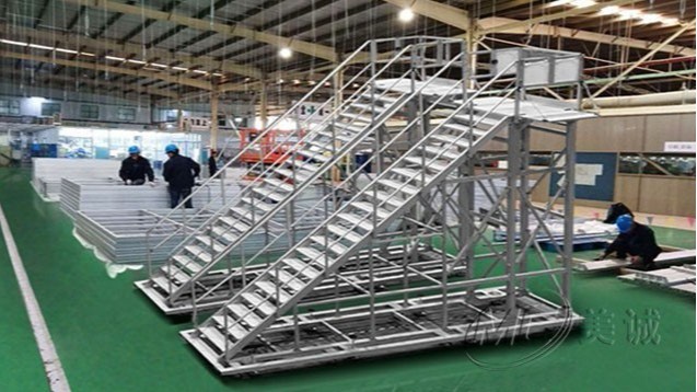 踏步工業梯 由專用工業鋁型材作為框架,其需求根據客戶制定進行免費設計、切割加工,配件連接而組成,其中塔臺部分運用了防滑鋁板,可以起到很好的保護作用,底部使用金屬蹄角做支撐,扶手為圓管鋁合金。